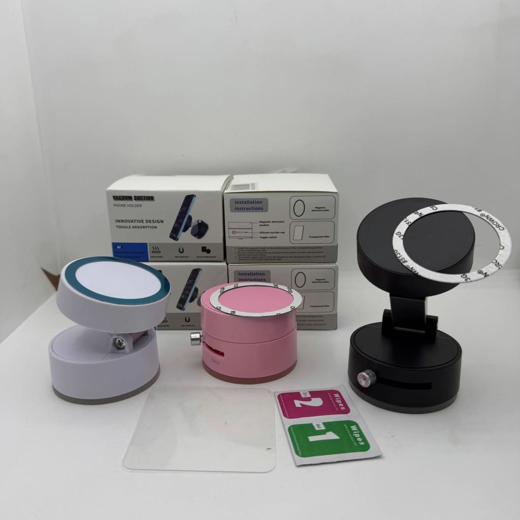 Olvidate de los soportes grandes y toscos. El Soporte Magnético con Succión al Vacío es tecnología pura: se adhiere con fuerza industrial y sostiene tu celular con un solo toque.